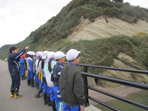 理科センターの船山先生から、長岡市の落水川河口にある地層を案内していただきました。