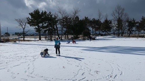 21日(水)に、1年生がグラウンドで雪遊びを楽しみました。