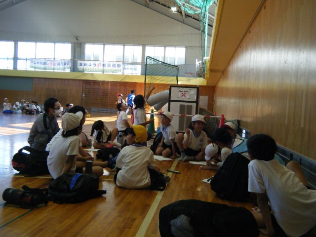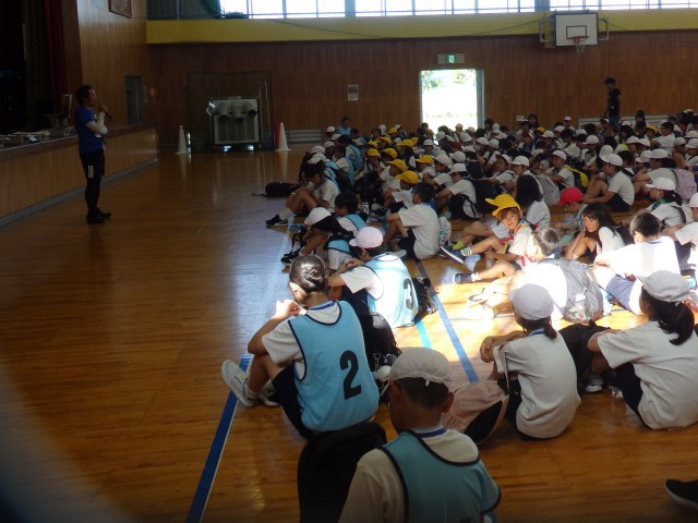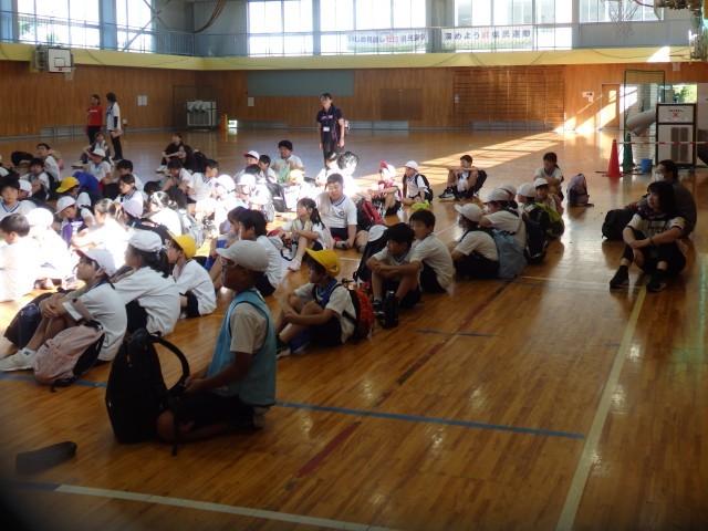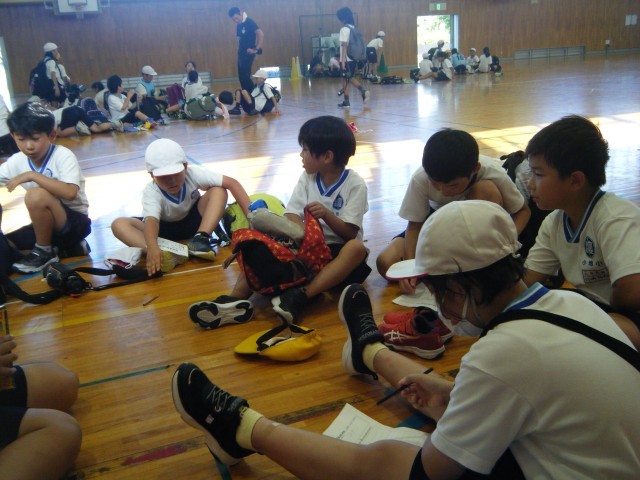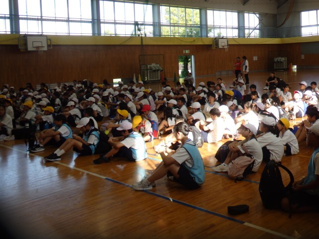 学校に戻ってきました。昨年までの登山と違い、帰りも歩くので少し疲れている子もいましたが、皆が頑張りました。そして、体育館では、6年生のリーダーを中心に円になり、振り返りをしました。ある6年生は、「お茶の美味しさが初めて分かりました(^_^)(>_<)」と言っており、この遠足でしか体験できない大きなことを学んだようです。