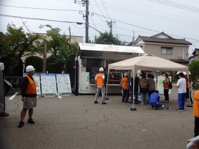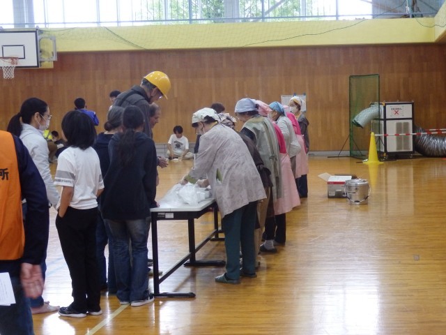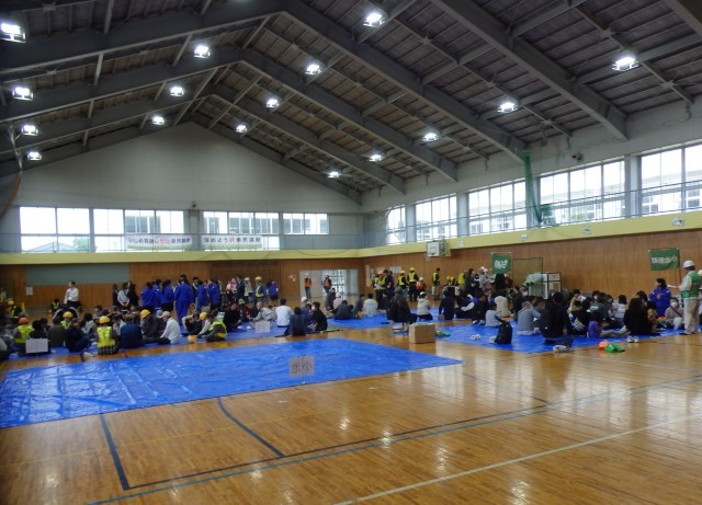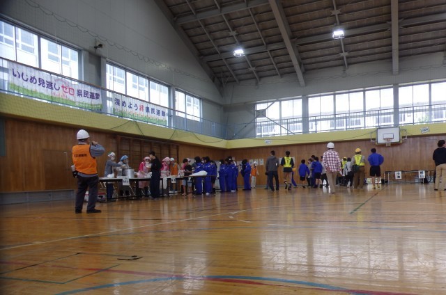 8:30に地震発生、その後、いっとき避難所へ集合して安否を確認し、指定の避難所へ避難するという流れです。中学生は午前のみの登校日だったので全員参加し、小学生は来れる子が参加していました。避難してきたら、炊き出しのご飯とワカメの味噌汁をいただいていました。小池小学校の玄関前駐車場には、地震体験車が来ていたので、体験もできました。