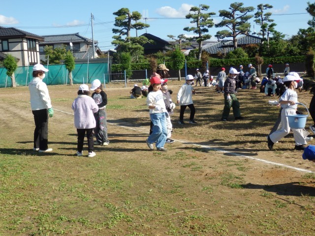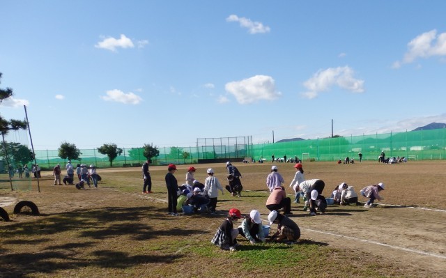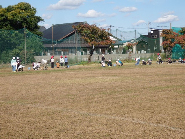 今日は、秋晴れで、天候に恵まれました。そんな中、清掃の時間は、なかよし班による清掃ではなく、全校児童が学年別に分かれて、グラウンドで外清掃をしました。これは、来週30日(木)のマラソン記録会へ向けての準備です。「こんな大きな草が取れた」「虫がいる、先生、これ、何ですか」等と言いながら、子どもたちは、草を取り、石を拾っていました。一生懸命に働く子どもが多かったと思います。今日の整備で、グラウンドも少しは走りやすくなったと思うので、マラソン記録会では、全員が、自己ベスト記録を出しましょう(^_^)