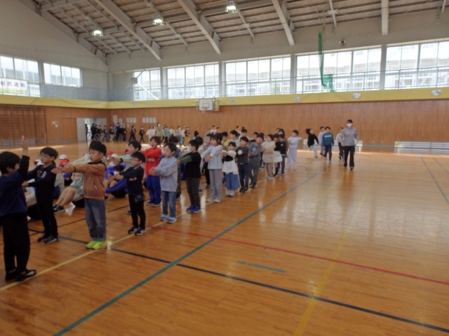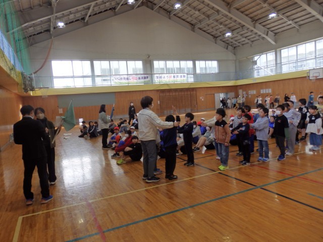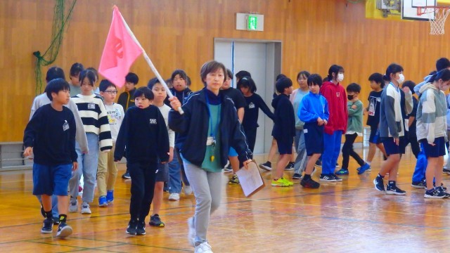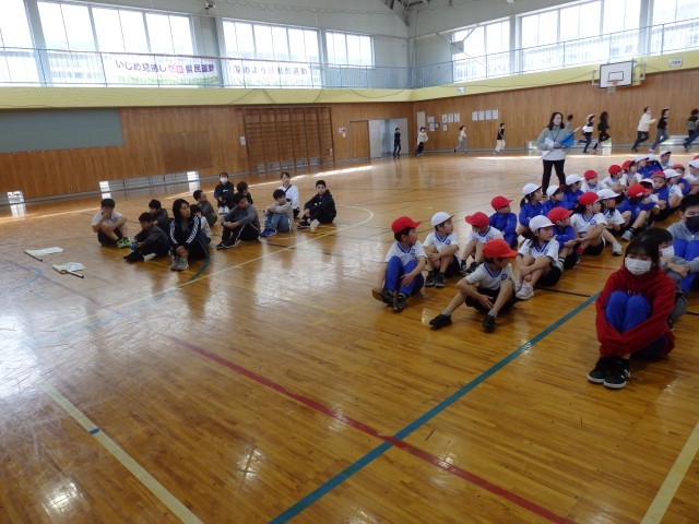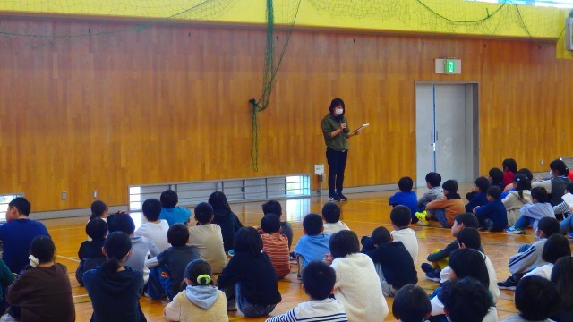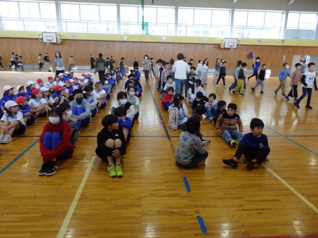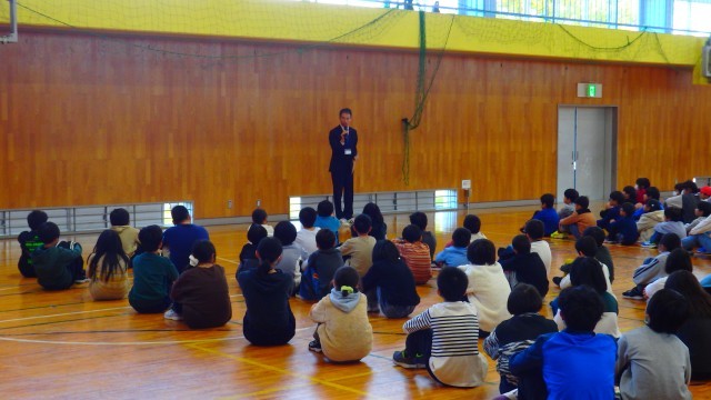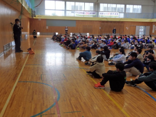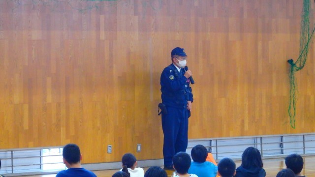 体育館へ集合したら、人数確認と報告を行い、避難完了。その後、小池駐在署の田口さんから、お話をいただきました。無駄話をせずに避難できていてよかったことと、日常生活での正しい過ごし方について、大切なお話をいただきました。校長からは、「避難訓練は、どんな時でも100点満点でなければ、自分の命を守ることはできない」という話がありました。多くの児童がよかったとは思いますが、体育館に来る時や田口さんの話を聞く時はどうだったかを、校長が振り返らせる場面もありました。