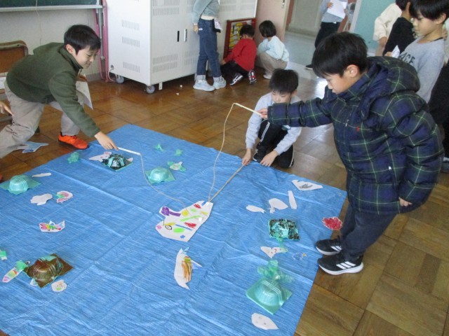 けん玉・どんぐりごまとやじろべえ・魚釣りとマラカス・ドングレース・どんぐり迷路等の遊びがありました。「いらっしゃいませ」と元気よく言ってくれた子どもたち。ルール説明をしたり、遊びの仕事をしたり・・・お客さんに喜んでもらおうと、一生懸命でした。お客さんとして来た子どもたちと先生方は、楽しんでいました(^_^)