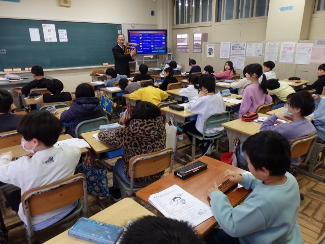 先日、2日間に渡り、校区内の岩崎珠算学園の園長岩崎様にご来校いただきました。岩崎様には、3年生と4年生のそろばん学習のご指導をしていただきました。