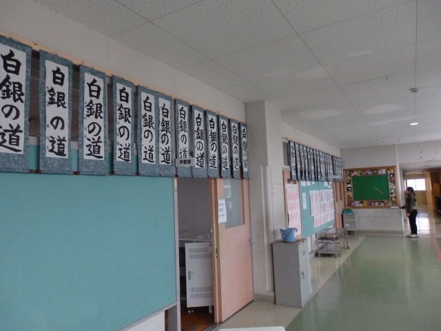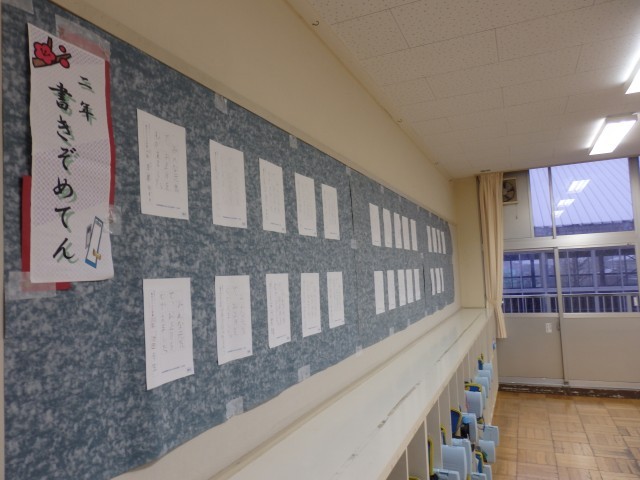「校内書き初め展」は、明日1/15(木から1/23(金)です。そこで、本日、放課後、職員作業で書き初めを展示しました。書いた作品の中で上手くできたものを、展示してあります。16時頃までは、玄関を施錠してありますので、インターホンでお名前を言ってお入りください。(ついでにお子さんの授業の様子も見ていただいてもよろしいいです)16時頃~17時頃までは、児童玄関を開けてありますので、ご自由にお入りください。お待ちしています。(駐車場は、プール跡の駐車場をご利用ください。)