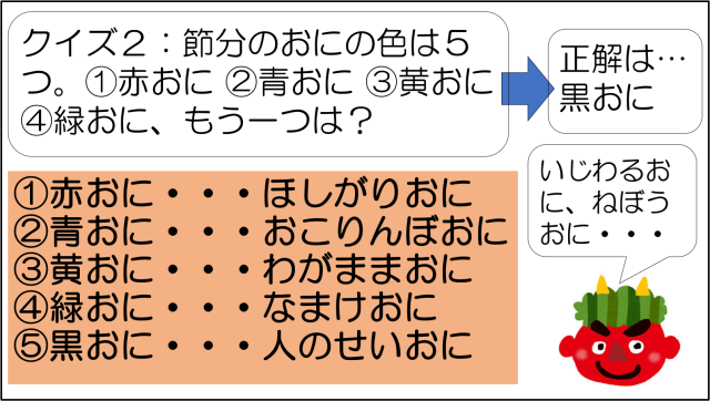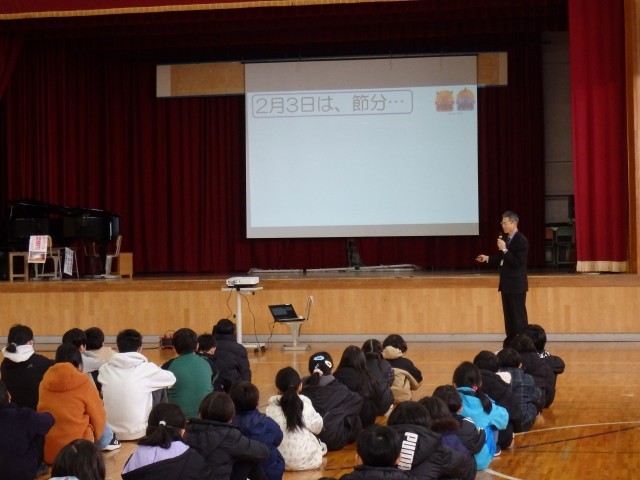 校長からは、プレゼンテーションで、節分※についての話がありました。節分の豆まきとおにについてのクイズがあり、近くの人と相談して答える時間もありました。