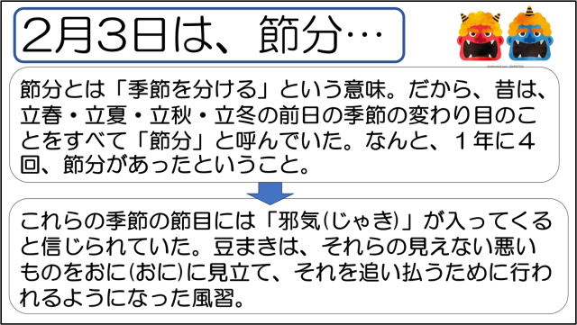 ※節分とは「季節を分ける」という意味。昔は、立春・立夏・立秋・立冬の前日の季節の変わり目のことをすべて「節分」と呼んでおり、1年に4回、節分があった。これらの季節の節目には「邪気(じゃき)」が入ってくると信じられていた。豆まきは、それらの見えない悪いものをおに(おに)に見立て、それを追い払うために行われるようになった風習。