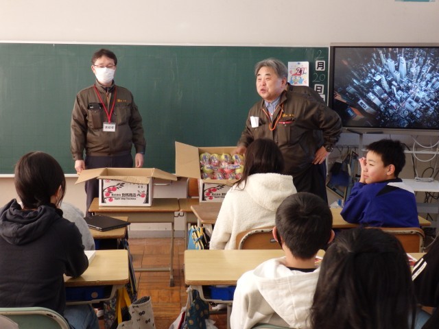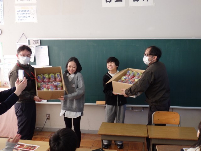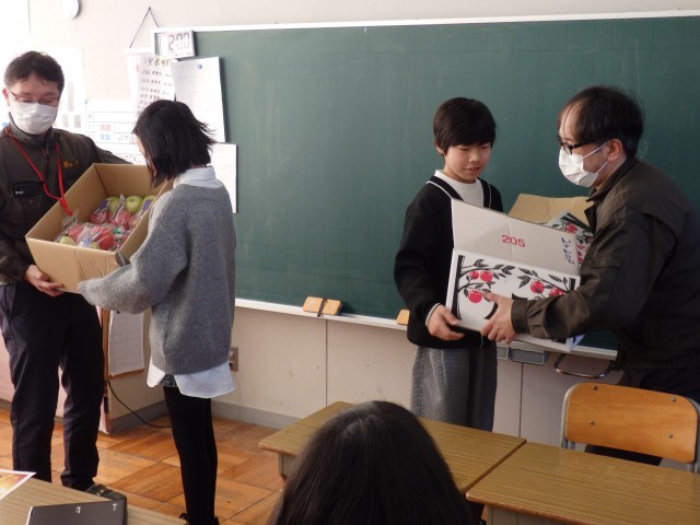 リンゴ贈呈に当たり、リンゴについて放送で説明をしていただきました。その後、6年生が代表して、教室でリンゴを受け取りました。きちんと全員でお礼も言っていました。ご家庭で、リンゴをおいしく召し上がってください(^_^)