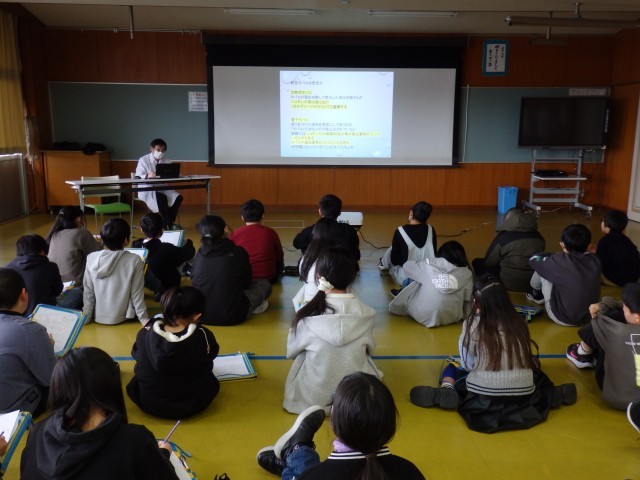 先週2月19日(木)の5限、視聴覚室で、6年生の「薬物乱用防止教室」を行いました。星薬剤師さんに来校していただき、お話をしていただきました。子どもたちは、星薬剤師さんのプレゼンを見て話を聞き、一生懸命にメモしていました。貴重な学びの時間となりました。