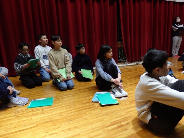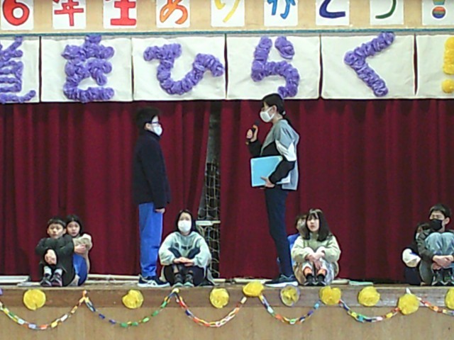ステージ上で、現6年生の委員長から5年生の新委員長へ、委員会活動で使うファイルなどを渡しました。そして、6年生の委員長は、引き継ぎの言葉を言い、5年生の新委員長はこれから頑張ることなどの抱負を言いました。これで、新年度へ向けて委員会活動のよいスタートが切れそうです。