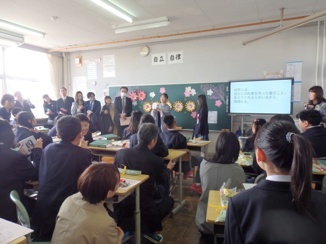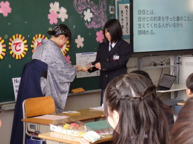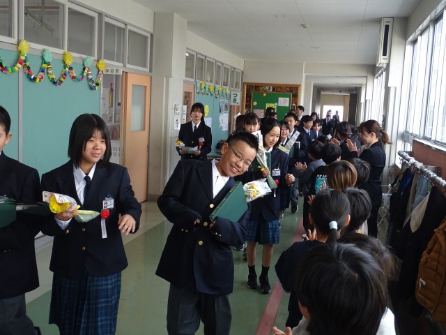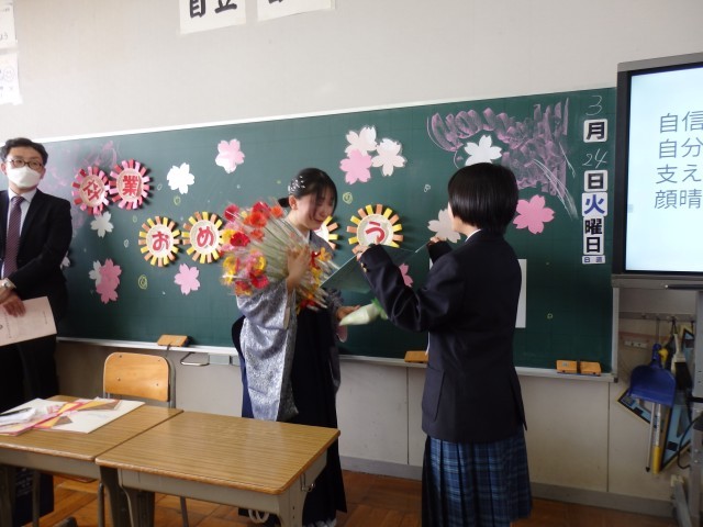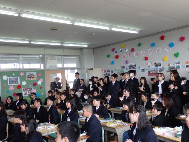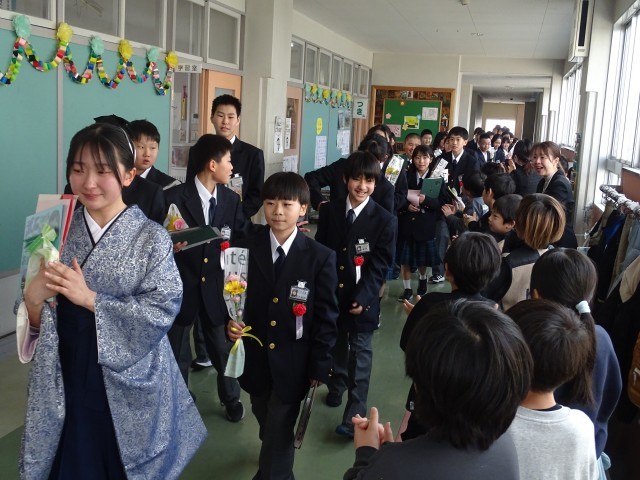 3/24(火) 卒業、おめでとう!②〜卒業式後の様子〜 公開日 2026/03/24 更新日 2026/03/24 小池小ブログ 卒業式後は、6年月組教室へ戻りました。担任の話を聞いたり、担任直筆の色紙をもらったり、担任へ花を渡したり・・・笑顔と感謝に包まれた、温かな空間でした。 その後は、在校生に見送られて体育館へ移動しました。集合写真撮影後は、友達や家族、担任と写真撮影や談笑など・・・。とてもよい時間を過ごしました。卒業、本当におめでとう(^_^) +7