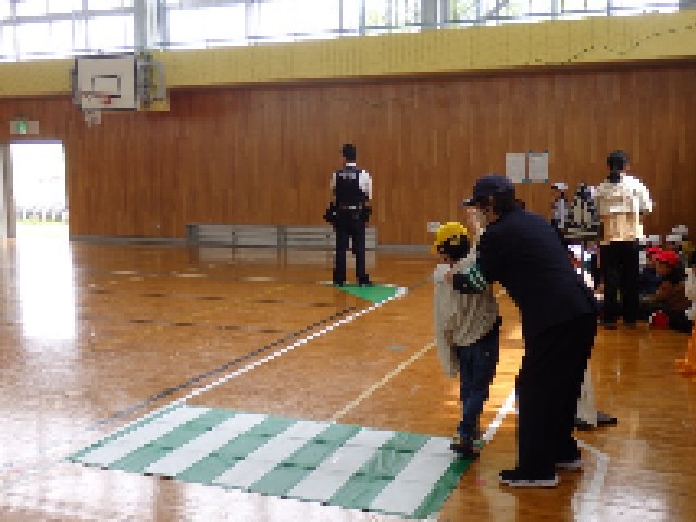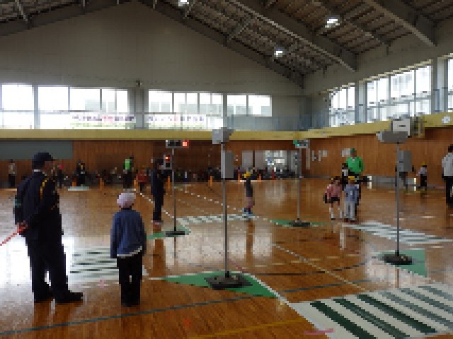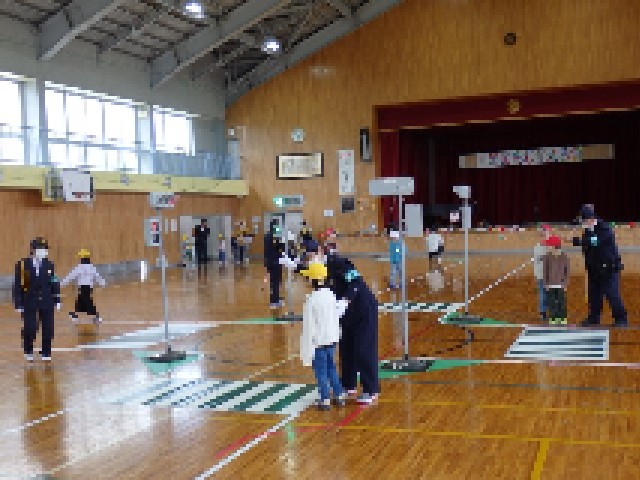 今日4/28(火)の2限の体育館で、1・2年生の交通安全教室を行いました。警察署や交通安全協会の方々に来ていただき、交通ルールを教えていただきました。信号、交差点、一時停止の場所、踏切等では、「止まる・見る・待つ」の約束を守ることが大切です。その約束を守り、体育館に作られたコースを、歩きました。登下校や普段の外出でも、ルールを守り安全に過ごしていきましょう(^_^)