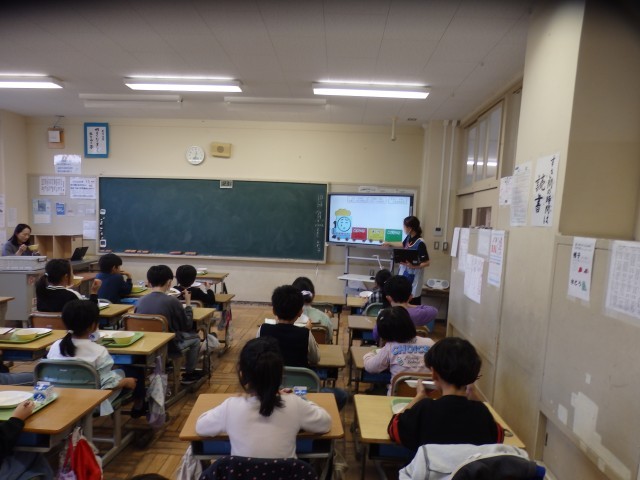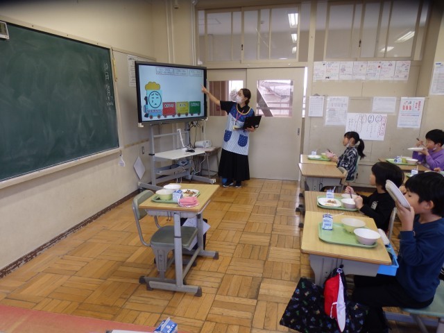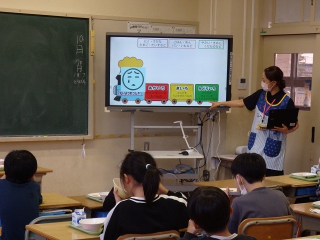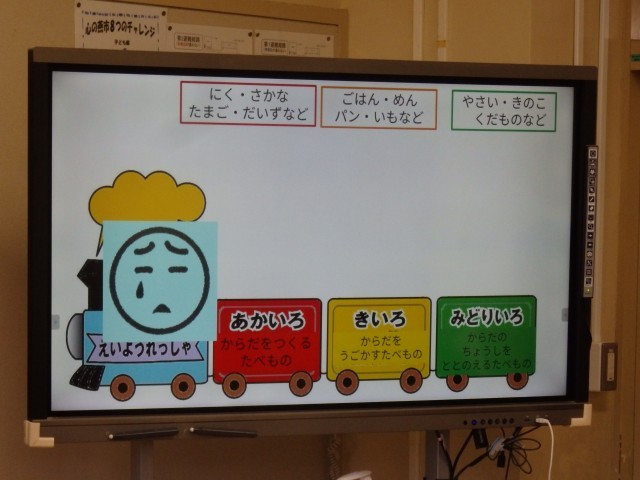今日は、給食時に、栄養教諭さんが来校され、2年生の様子を見ていかれ、栄養指導をしていただきました。栄養指導は、「栄養列車を元気に走らせよう」というお話でした。赤・青・黄の食品を、好き嫌いせずにバランスよく食べることの大切さを、大型画面のプレゼンで学ぶことができました。