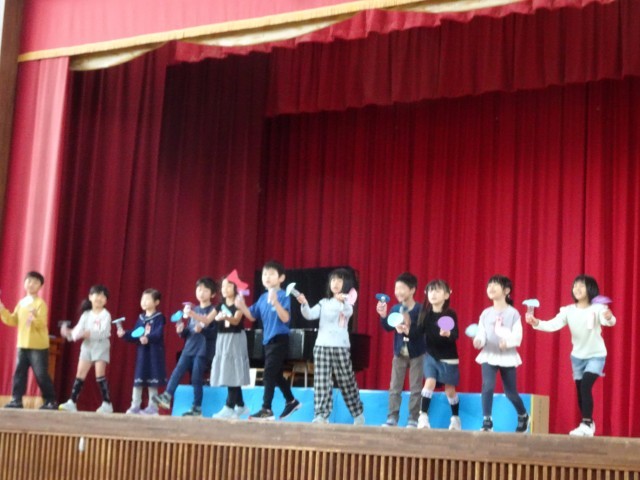 1年生にとっては、初めての文化祭でした。練習を始めた頃は、声が小さかったり、自分の出番を忘れてしまったりすることもありましたが、練習をするたびにどんどんと上手になりました。一人何役ものお面の早替えも大変でしたが、1年生みんなで力を合わせて劇を成功させることができました。