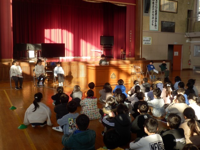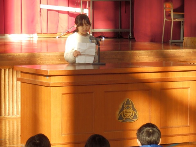 始めに、6名の代表が2学期を振り返り、各教科や児童会行事「大関まつり」で頑張ったこと、そして3学期に向けた抱負を発表しました。
