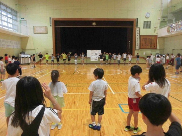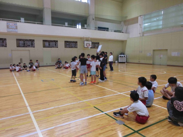 はじめに6年生が作ったあいさつの歌。毎朝下学年の教室で一緒に歌ったかいがあって、全校のみんなで振りをつけて歌うことができました。