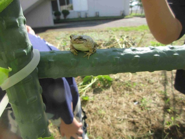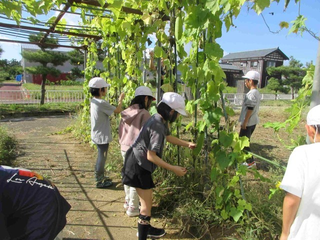 大きく育ったヘチマの実を見てみんなうれしそう。