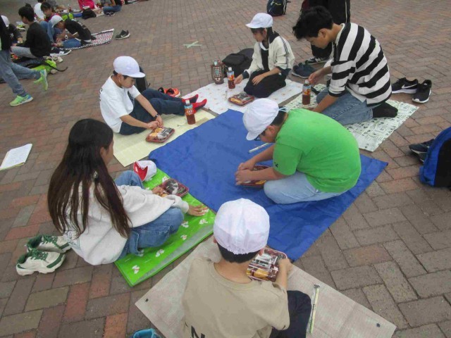 自然探検ウォークラリーのあとは、入所式を行った屋根付きの広場(ビッグシェルというのだそうで)でお昼ご飯を食べました。