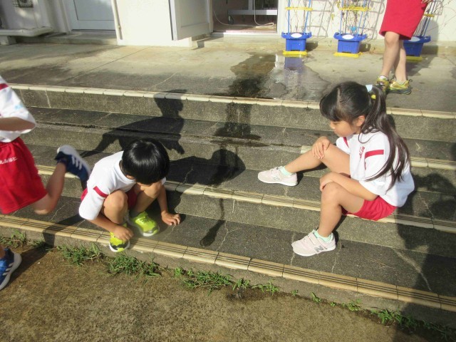 最後の画像は水やりで鉢から染み出た水が階段を流れ出た水を追いかける子どもたち。こんなことにも好奇心をむけられるのですね。とってもすてきです。