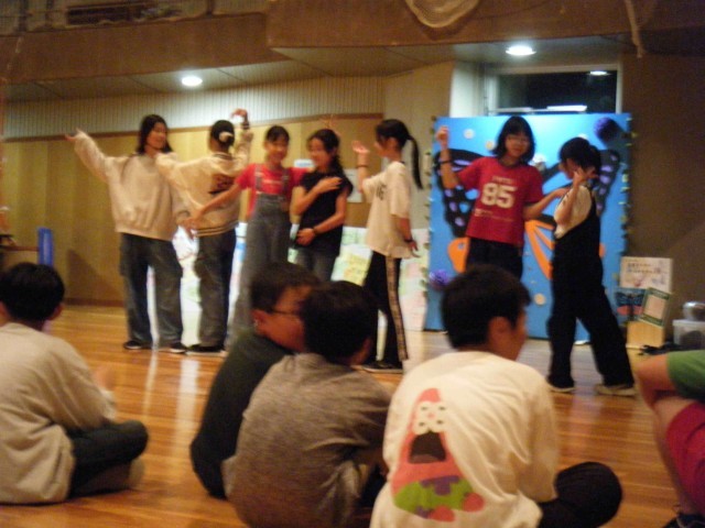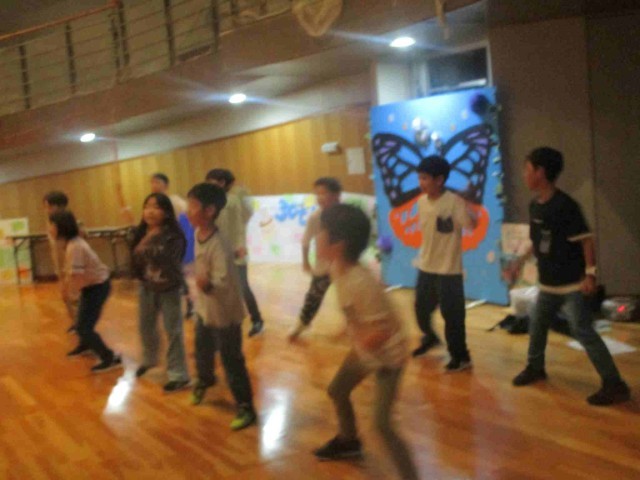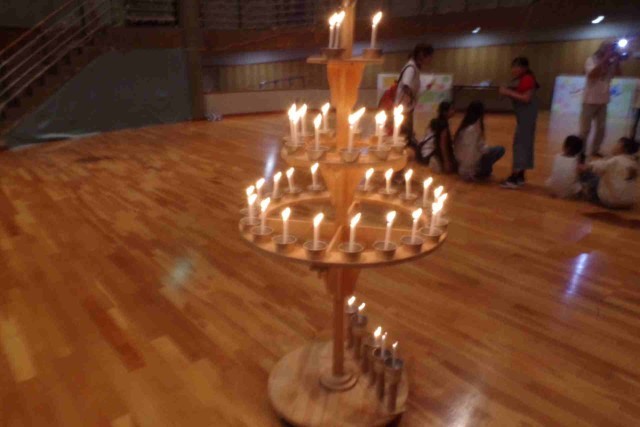 館内にある「もりもり亭」という食堂で夕食をいただいた後は、雨天のため室内でキャンドルサービスを行いました。