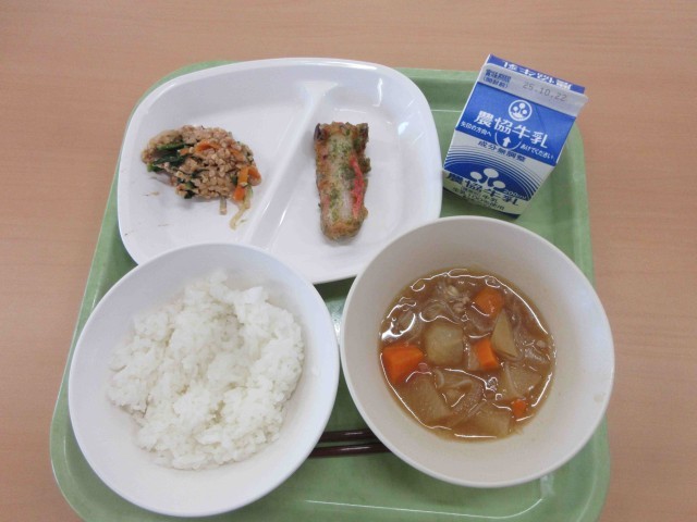 今日の献立は、ご飯、大根のそぼろ煮、納豆の五菜あえ、ちくわのお好み揚げ、そして牛乳です。