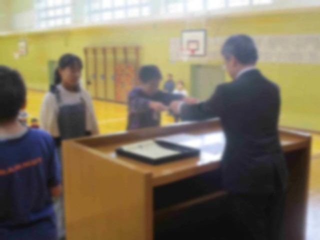 今月のスマイル朝会は後期学級委員の任命式とマラソン大会上位入賞者の表彰でした。