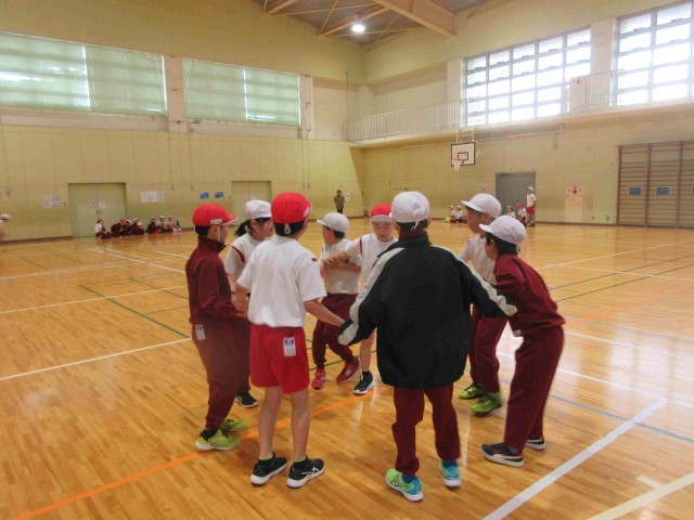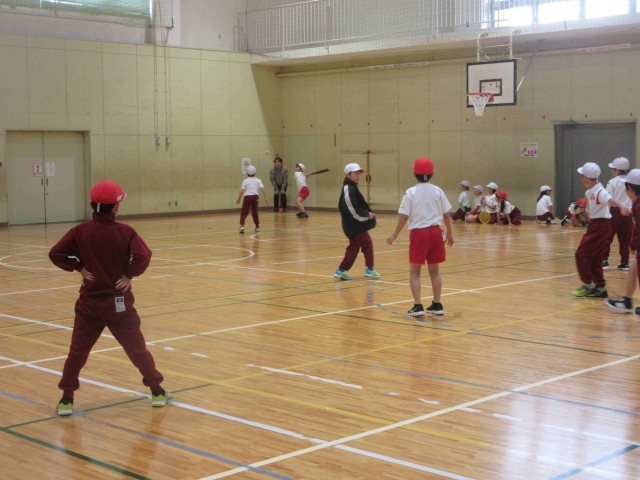 ベースボール型のゲームに取り組んでいました。野球やソフトボールのように攻撃と守備がはっきり入れ替わるタイプの球技を指します。(ちなみに小学校体育では、他には「ネット型」(バレー・テニスなど)「ゴール型」(サッカー・ハンドボールなど)の球技を学びます。)