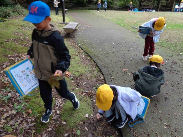 ますはブルーシートでベースキャンプを作ってから班ごとに落ち葉や木の実を探します。