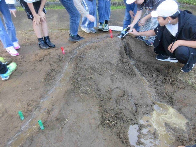 5年生理科 公開日 2025/11/04 更新日 2025/11/04 学校日記 金曜日に作った山を使って川の流れが地形に与える影響を調べました。削られたり、上流から流れてきた土が積もったりとみるみる地形が変わっていく様子に興味を持っていました。