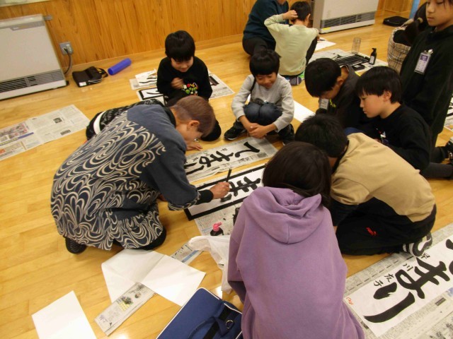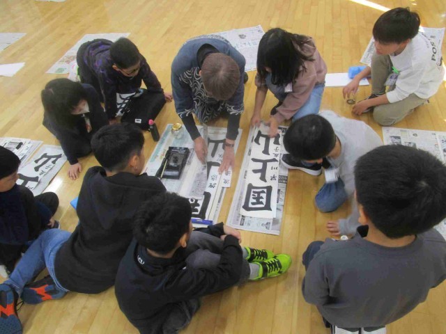 地域の書道の先生をお招きして、良寛書道展の課題について手ほどきを受けました。