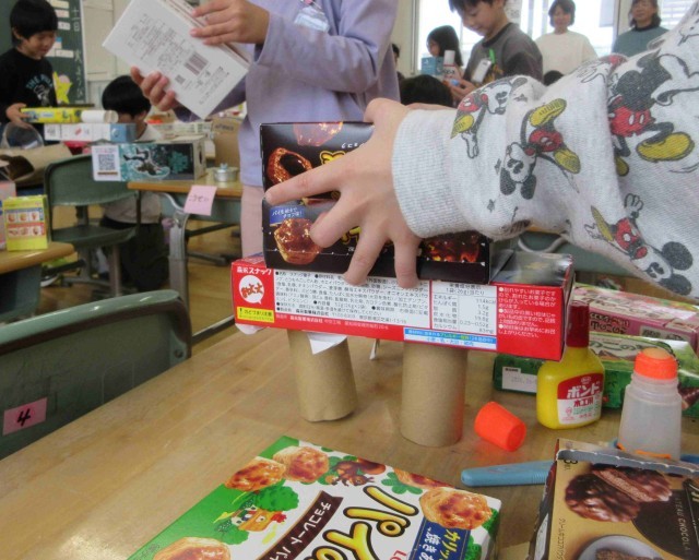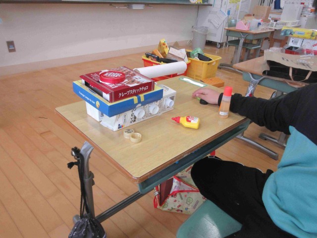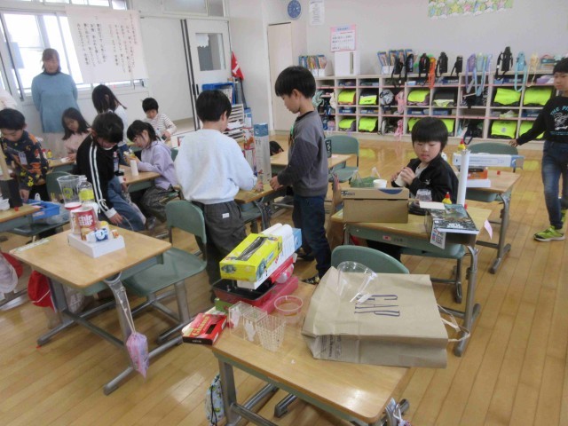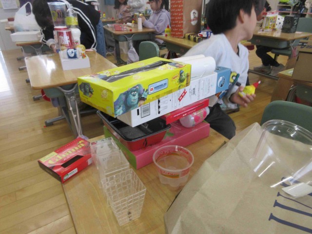 1年生の各ご家庭で集めていただいた空箱や空き容器がすてきな作品に生まれ変わりつつあります。