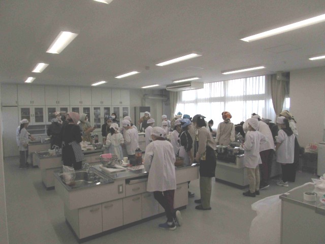 おにぎりと一緒に作ったのは野菜がたくさん入った豚汁です。おうちの方と一緒に包丁で食材を切ったり、火を使ったりと子どもたちには貴重な体験となりました。