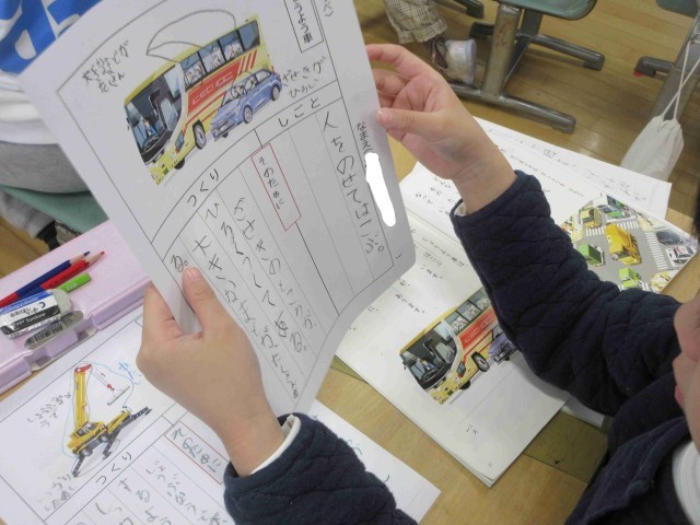 説明文教材「じどう車くらべ」の学習でした。