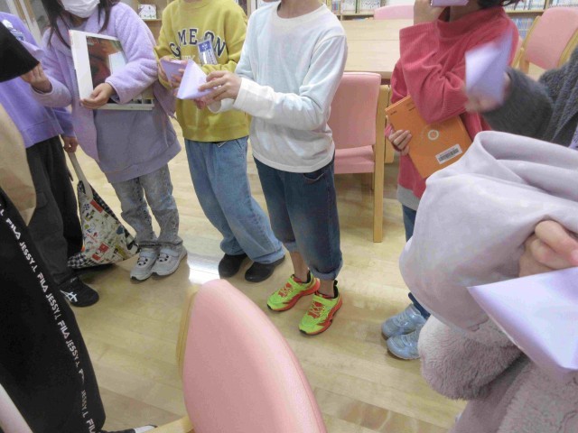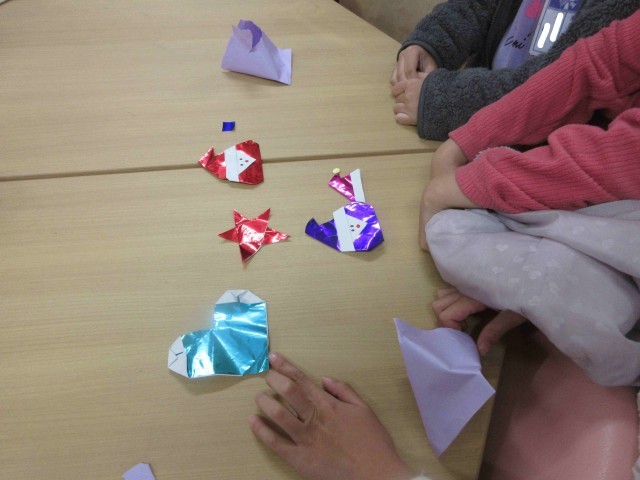 1,2枚め;もみじ読書旬間に併せて図書館を利用した人へのプレゼント。中からは図書委員が心を込めて折ったクリスマスにまつわる折り紙が。ツリーやリース、カードの飾りにぴったりですね。