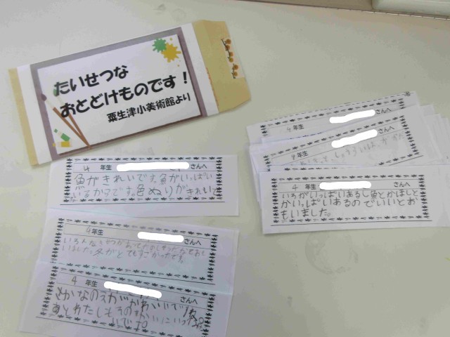 3枚め;秋彩祭で展示した各学年の絵画作品を鑑賞した仲間からの感想カードです。絵を心を込めて鑑賞しそれぞれのよさを見つけました。