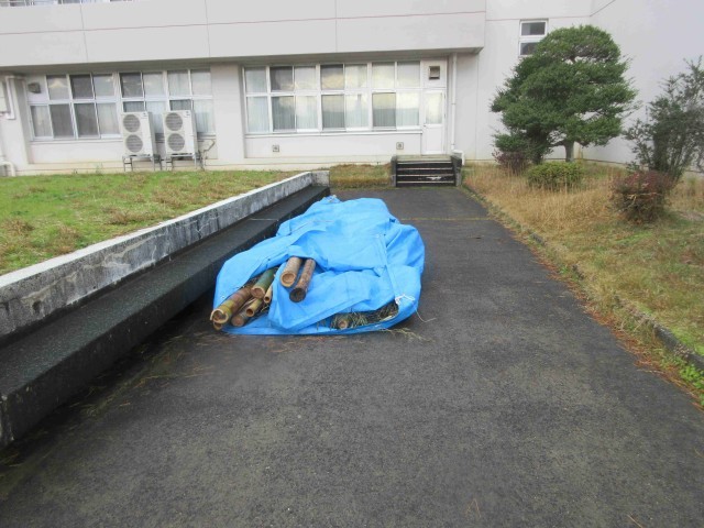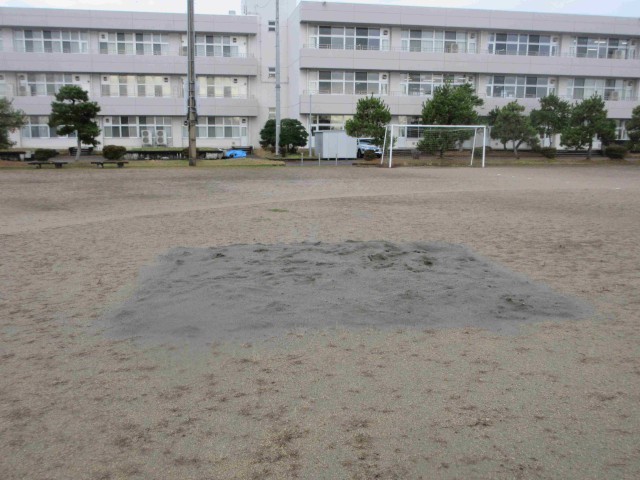 ビニールシートに覆われた長い竹、グラウンド現れた敷き詰められた砂の正方形、これらは1月18日にグラウンドで行われる塞ノ神の準備です。