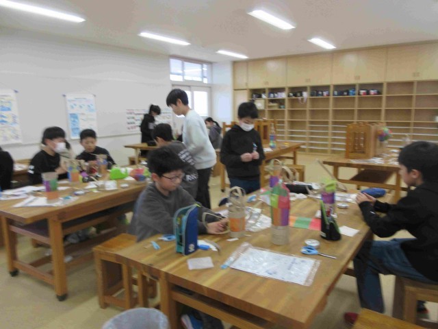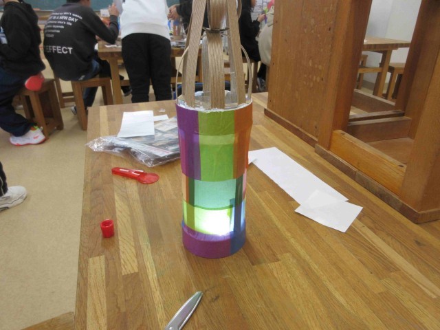 6年生図工 公開日 2025/12/18 更新日 2025/12/18 学校日記 透明のプラスチック(ペットボトルの素材ですね)色とりどりの紙を組み合わせてランプを作っています。試しに灯りをともしてみると。素敵ですね。みんなの仕上がりが楽しみです。