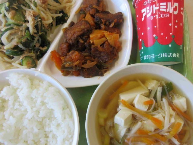献立は、ごはん、酢豚、わかめサラダ、春雨スープ、そして飲むヨーグルトクリスマスバーション。