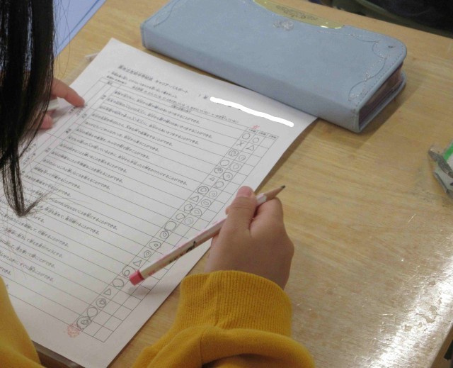 2学期最後の学級活動で行うもう一つ大切な内容が2枚目の画像。キャリアパスポートの自己評価です。キャリアパスポートとは、将来の社会的職業的な自立を見据え、節目ごとの成長を振り返り、記録するものです。吉田中学校区共通の評価項目を使い、小学1年生から中学3年生までの9年間の足跡をファイルに綴っています。
