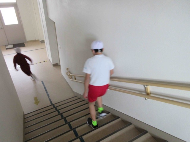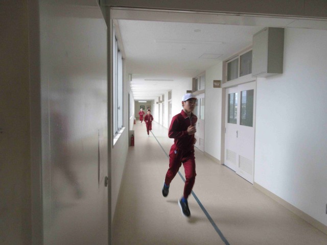 体育館玄関ホール、ギャラリー、2階特別教室前廊下、1階特別教室前廊下をつないだルートをランニング。