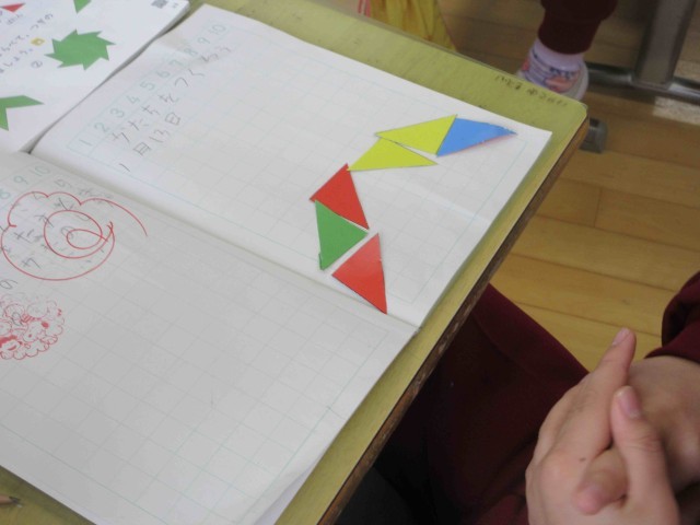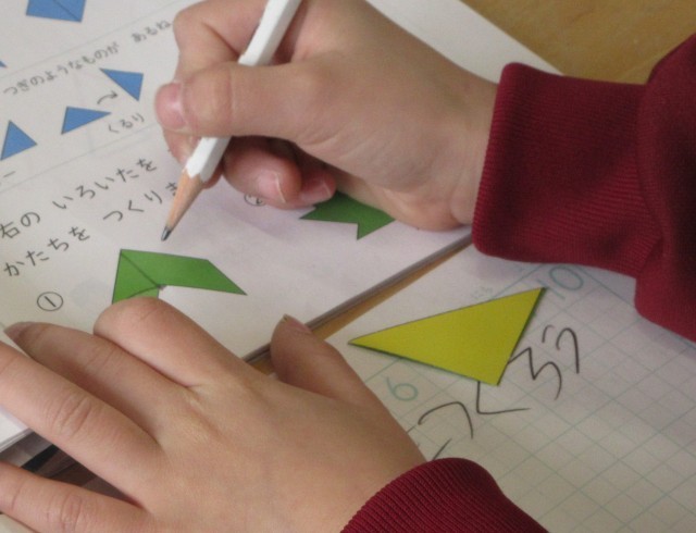 三角形のタイルを組み合わせて教科書に示された形をつくります。