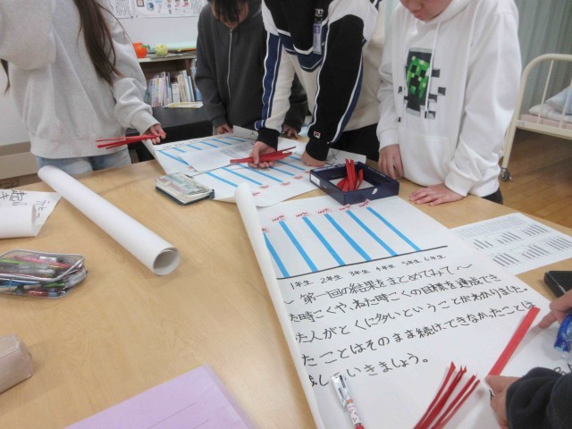 令和7年度の児童会活動の振り返り、給食週間、健康な生活についてのアンケート結果のまとめ、などなど。