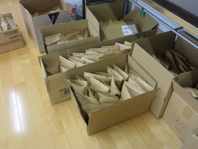 先日、苦労して3階まで運び上げた米を2合ずつの小袋に分けています。袋にはオリジナルのラベルを貼る予定です。