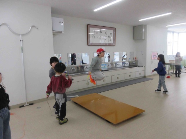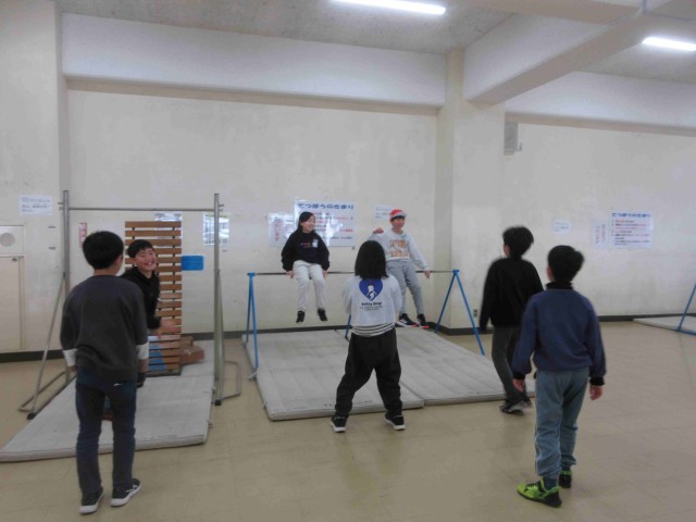 1枚め;体育館ギャラリー。4年生が鉄棒で遊んでいるのは珍しい。