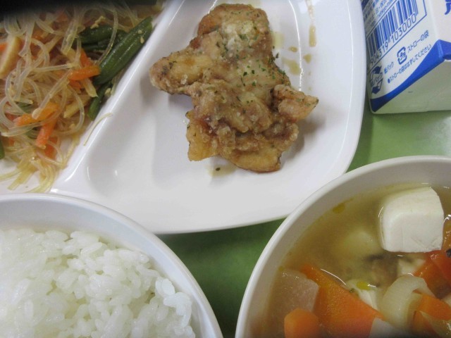 【1月19日の献立】ごはん、スキー汁、鶏肉のレモン和え、春雨炒め、牛乳