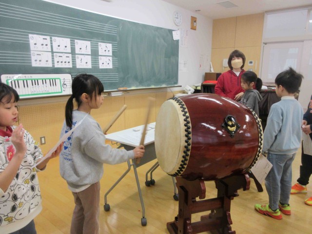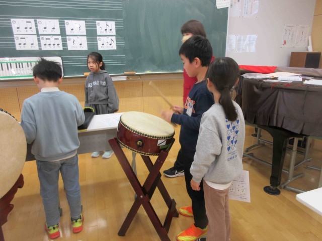 2年生音楽 公開日 2026/01/20 更新日 2026/01/20 学校日記 和太鼓を前に興味津々の子どもたち。2本のばちを握りしめ、楽譜に併せてリズムを打ちます。日本伝統の楽器の迫力のある音の響きを味わいました。