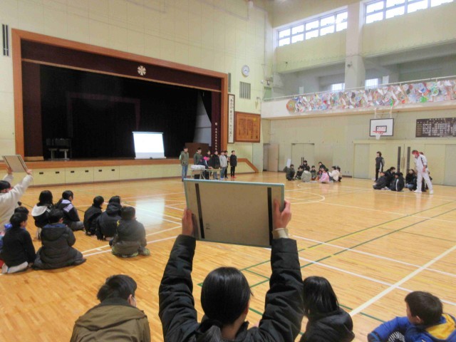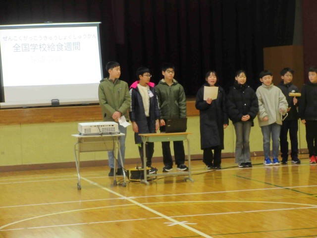 給食委員会の発表では、来週行われる給食週間のテーマにちなみ、給食の歴史についてのクイズでした。