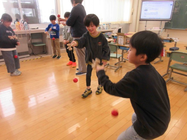 昔の遊びに挑戦 公開日 2026/01/27 更新日 2026/01/27 学校日記 1年生教室に、けん玉、お手玉、こまが登場しました。子どもたちが早速手をのばします。まだまだ覚束ない手つきですが、すぐに上達しそうです。これからが楽しみですね。