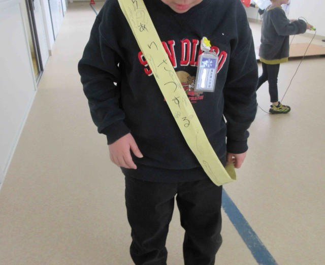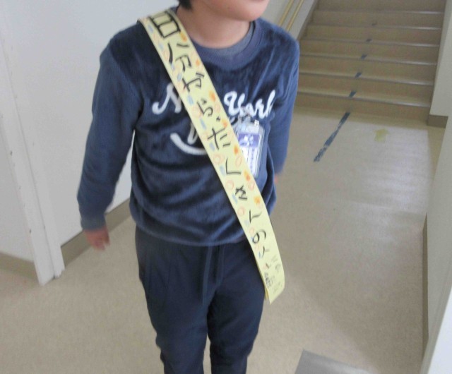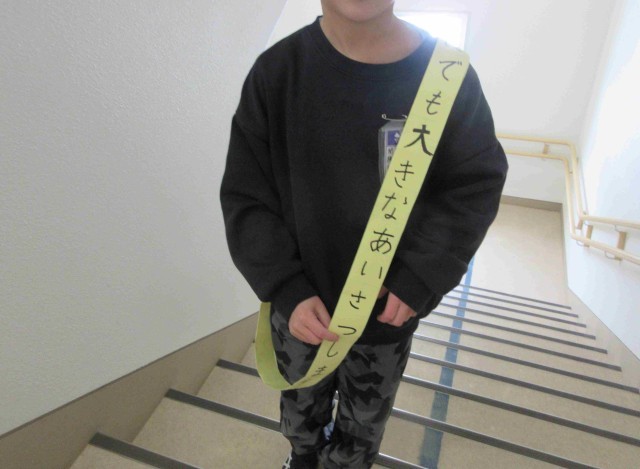 それぞれのあいさつのめあてをたすきに示して校舎を巡ります。