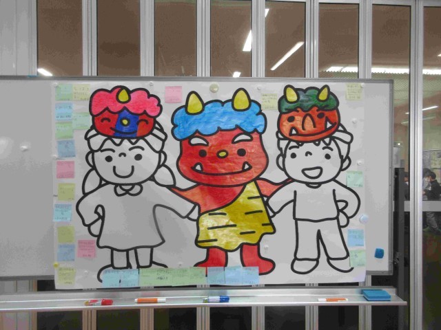 児童玄関前には節分らしいイラストが。自分の中から追い出したい鬼を付箋に書いて貼っています。